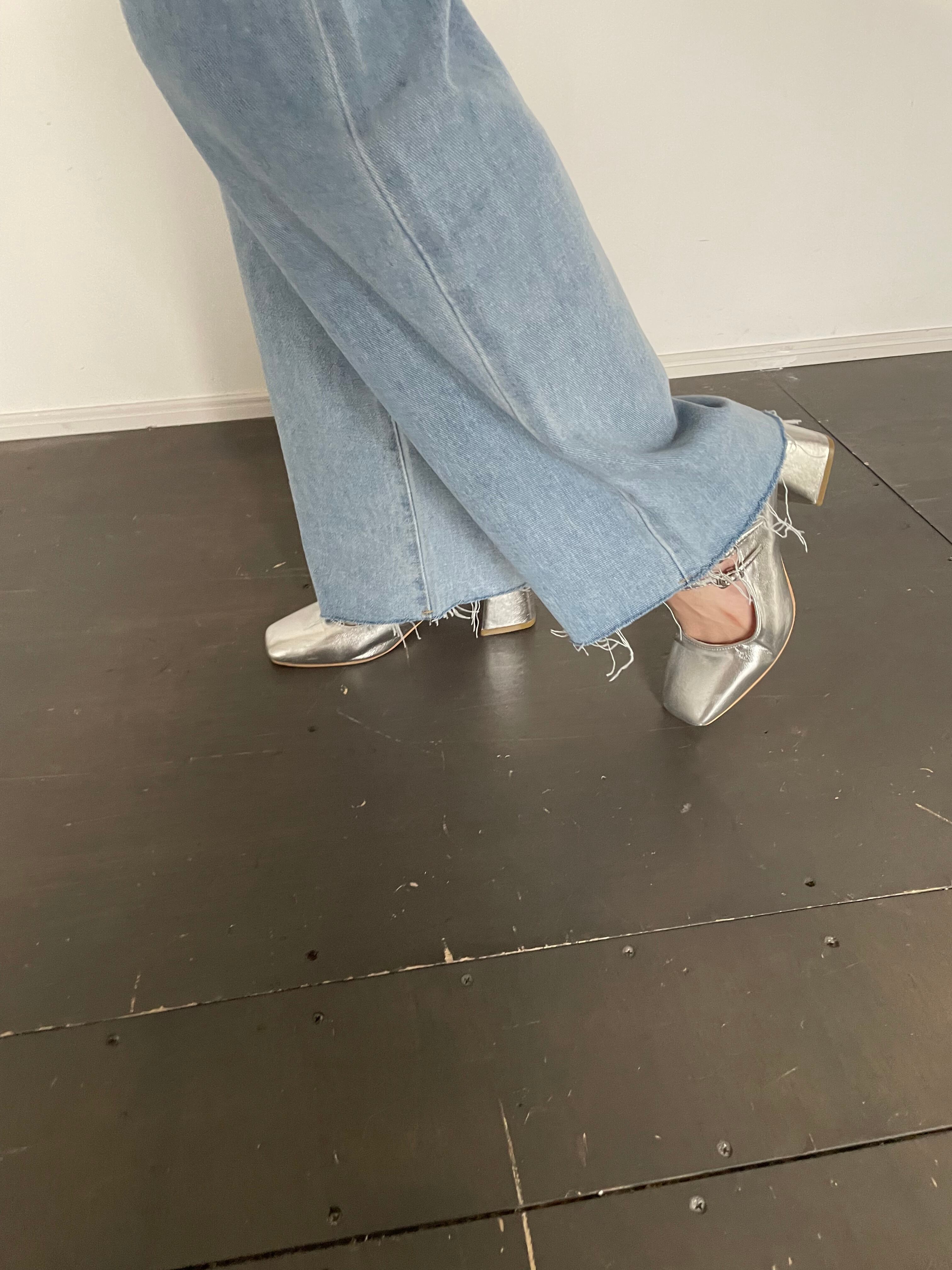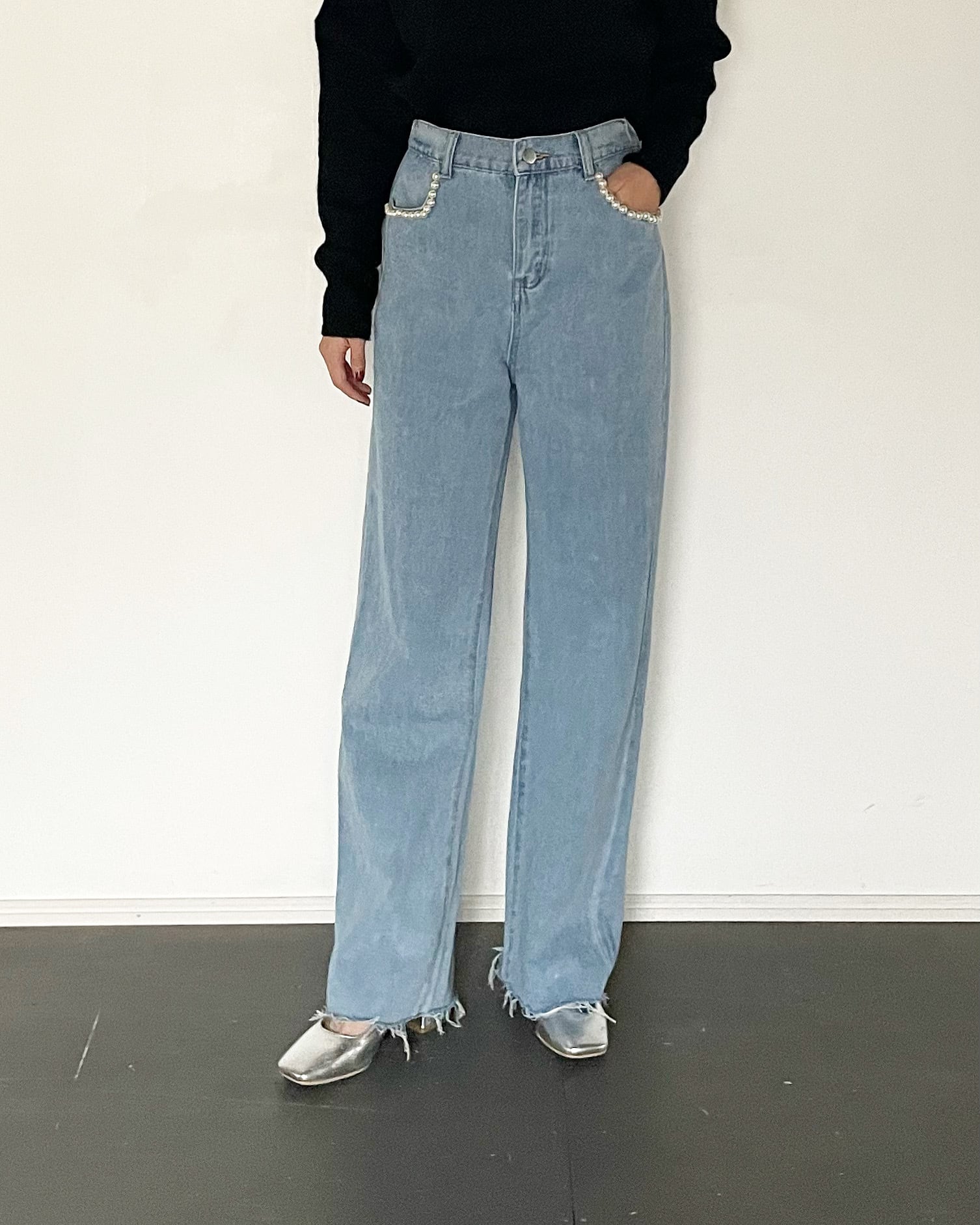 ウエスト周りににパールをあしらい華やかさを演出。ウエストにはゴムが入っており窮屈感なくお召し頂けます◎裾をダメージ加工にした事で甘さを軽減。